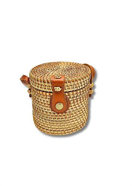 Thân túi bằng mây đan thủ công chắc chắn với họa tiết đan chéo.